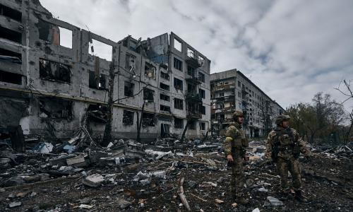 Ukrainian soldiers stand amid the ruins of a bombed building (Ukraine War)