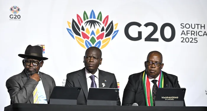 DIRCO Minister Ronald Lamola (centre), Gauteng Premier Panyaza Lesufi (right) and Minister of Finance Enoch Godongwana (left) during a media briefing ahead of the historic G20 Summit in Johannesburg (Image: G20 SA / X nee Twitter)