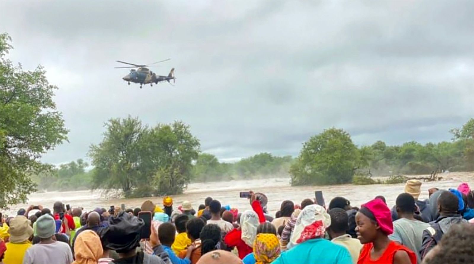 A search and rescue team from the SANDF’s 19 Squadron, tasked by the Air Force Command Post, is pictured hovering above Mbaula village [Image: SA National Defence Force]