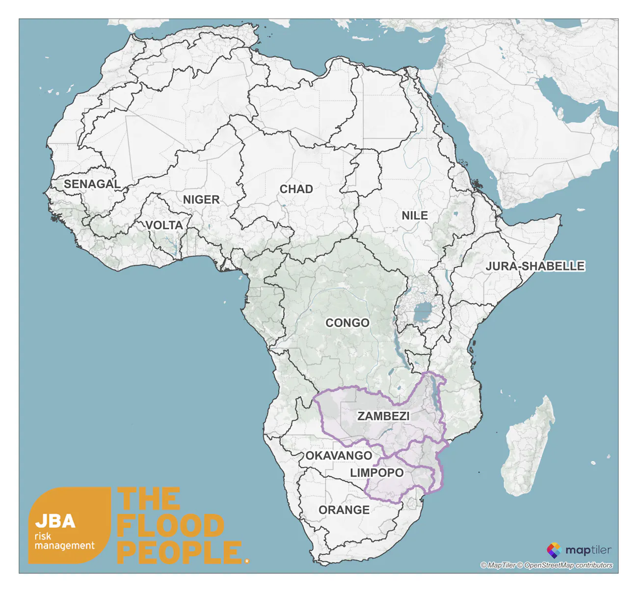 Map showing the major river basins across Africa, with the Zambezi, Limpopo and smaller coastal river basins in Mozambique highlighted in purple [Image: Map Tiler]