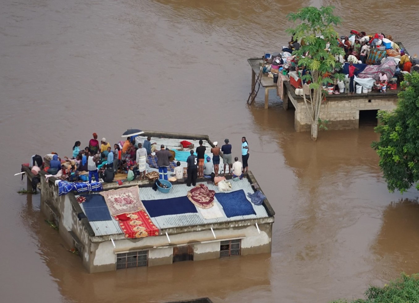 Community members in Maputo, Mozambique huddle up on the roofs of homes to avoid devastating floodwaters [Image: SADC/Facebook]