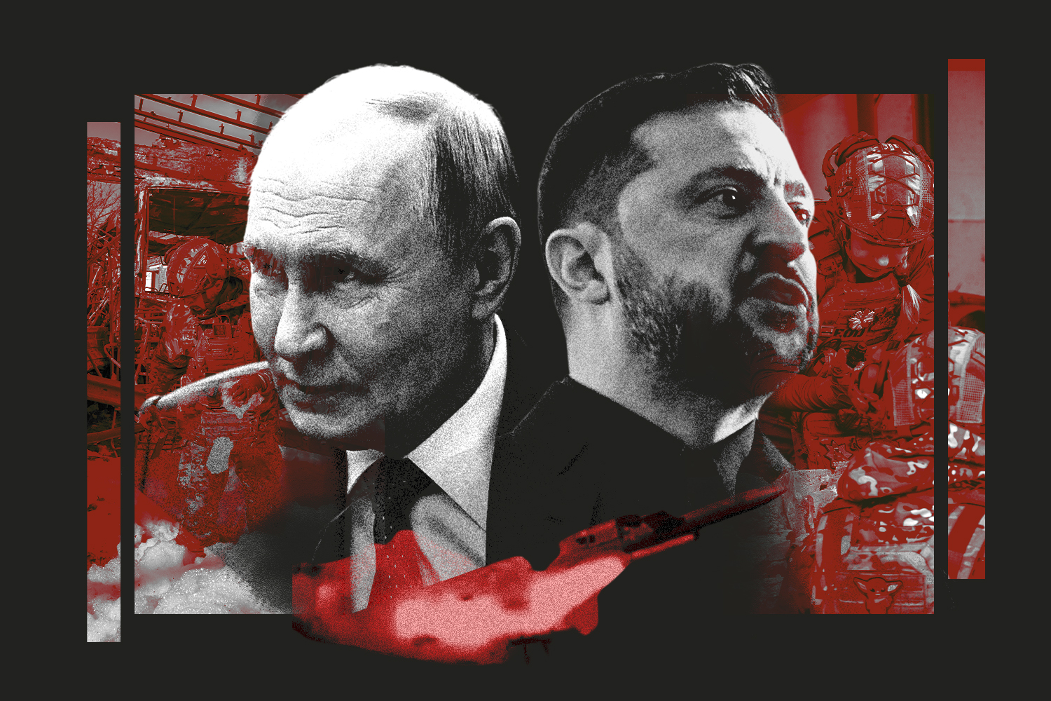 Illustrative image of Russia’s President Vladimir Putin (left) and Ukraine’s President Volodymyr Zelensky (right), with war missiles and aid workers etched into the foreground and background [Image: The Times]