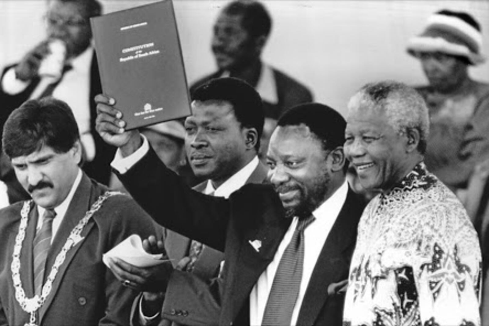 South Africa’s First Democratically Elected President Nelson Mandela (right foreground) standing beside a younger Cyril Ramaphosa, the current President of SA, proudly holding a copy of the South African Constitution at its signing in 1996. [Image: Robbie Botha]